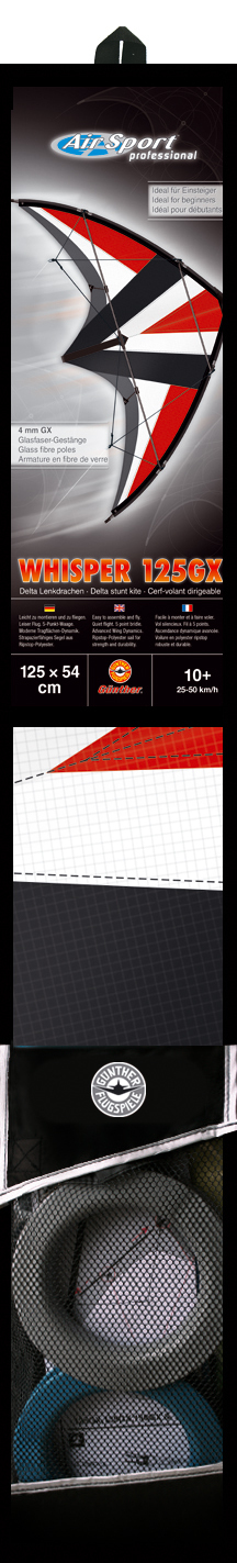 Günther Whisper 125 GX Sportlenkdrachen Der Wind ist perfekt für einen schönen Ausflug mit dem Sportlenkdrachen Whisper 125 GX. Fliege tolle Formationen, übe Kunststücke hoch in den Lüften und lass den Drachen nach Lust und Laune herumsausen. Der ideale Drache...