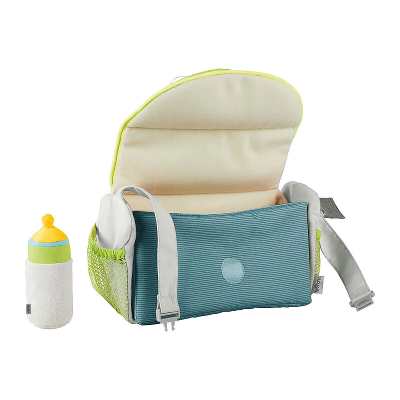 Alles dabei in der Wickeltasche Sommerwiese von HABASet mit umfangreichem, wirklichkeitsnahem Puppenzubehör - 2 in 1: Tasche und Wickelunterlage für die Babypuppe - tolles Design, waschbar bei 30C - Schultergurt mit Klickverschluss zum einfachen Anbringen an P...