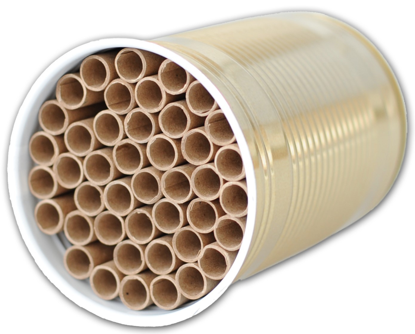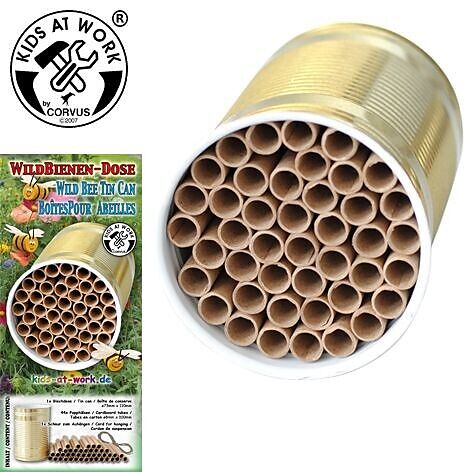 Wildbienen-Dose Die famose Wildbienen-Dose! Dose zwischen einer Mauerritze, einem Zaun, oder einem Baum/Astloch platzieren. Und schon können die Wildbienen einziehen! Inhalt: 44 Papphülsen mit 8mm Durchmesser als Bruthilfe. Geeignet für gehörnte und rote Mauer...
