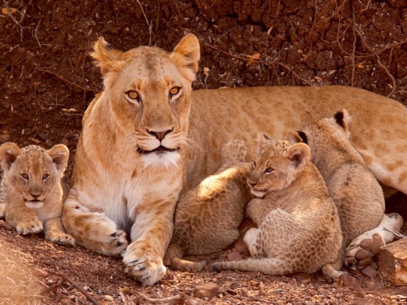 Löwen in ihrer natürlichen Umgebung, aufgenommen in Südafrika. Seien Sie hautnah dabei, wenn die Mutter ihre Jungtiere stillt oder das Rudel nach erfolgreicher Jagd entspannt.