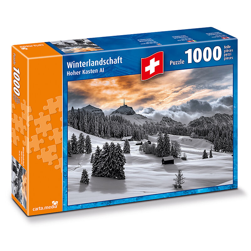 Winterlandschaft Hoher Kasten. Puzzle mit 1000 Teilen. Winterliche Landschaft mit Hoher Kasten Appenzell Innerrhoden. Puzzleformat 70 x 50 cm. Foto von Marcel Schiegg, Weissbad Hoher Kasten AI Auf dem Hohen Kasten, dem Schweizer Aussichtsberg, liegt einem die ...