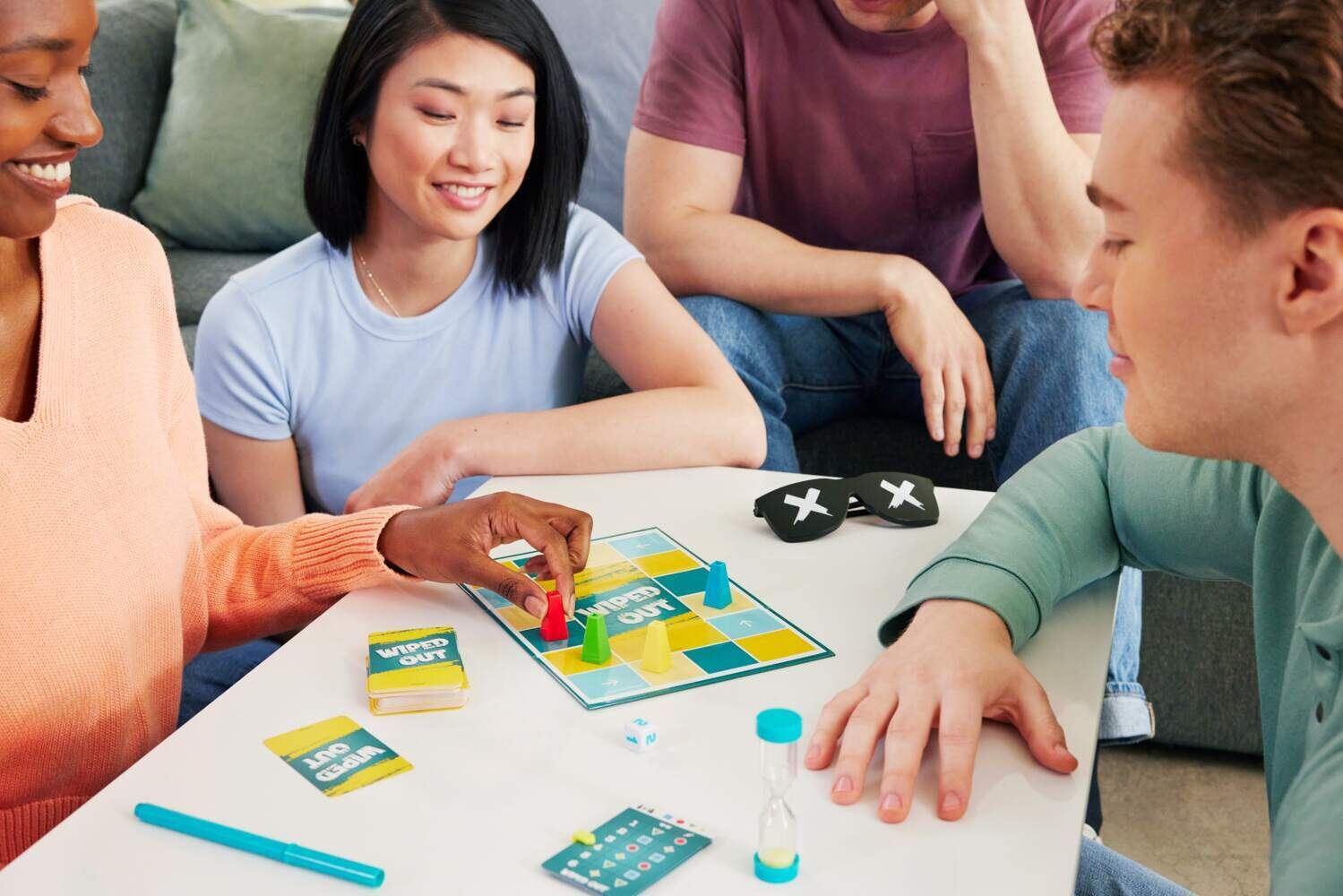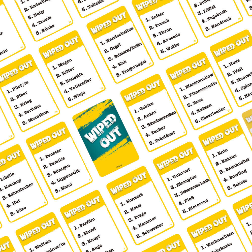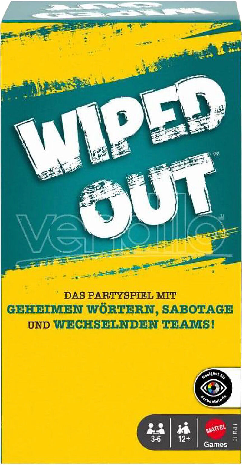Wiped Out (D) Bei dem Partyspiel Wiped Out können Spieler die Konkurrenz auslöschen. In jeder Runde kann man sich mit einem anderen Mitspieler zusammentun, um ein Geheimwort zu erraten. Dank einer stylischen Brille bleibt der Ratende im Dunkeln, während der Pa...