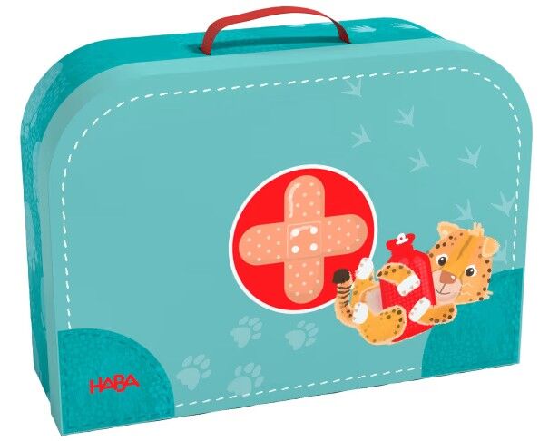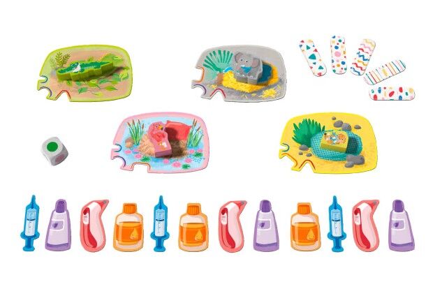 HABA MES-Wir verarzten Tiere Oh weh, die Tiere sind krank und müssen dringend behandelt werden: Das Krokodil hat Zahnschmerzen, der Elefant ist erkältet, dem Gepard tut der Bauch weh und der Flamingo hat sich das Bein gebrochen. Wer kann die Tiere am besten ve...