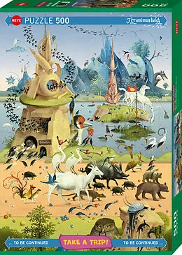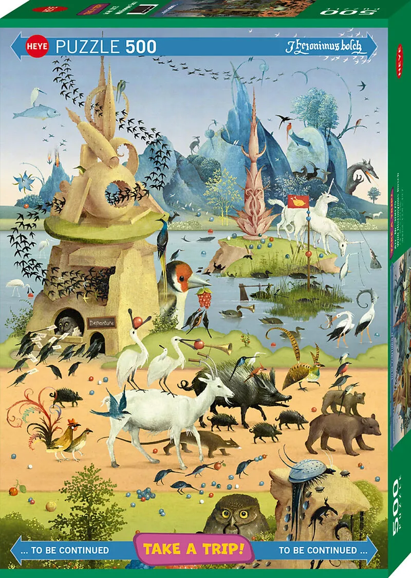 Die berühmten Figuren aus Hieronymus Boschs ikonischen Bildern bevölkern einen Abschnitt von Marino Deganos Straßenpuzzle-Serie. Passt perfekt an alle anderen! Gelegte Grösse: 35x50cm