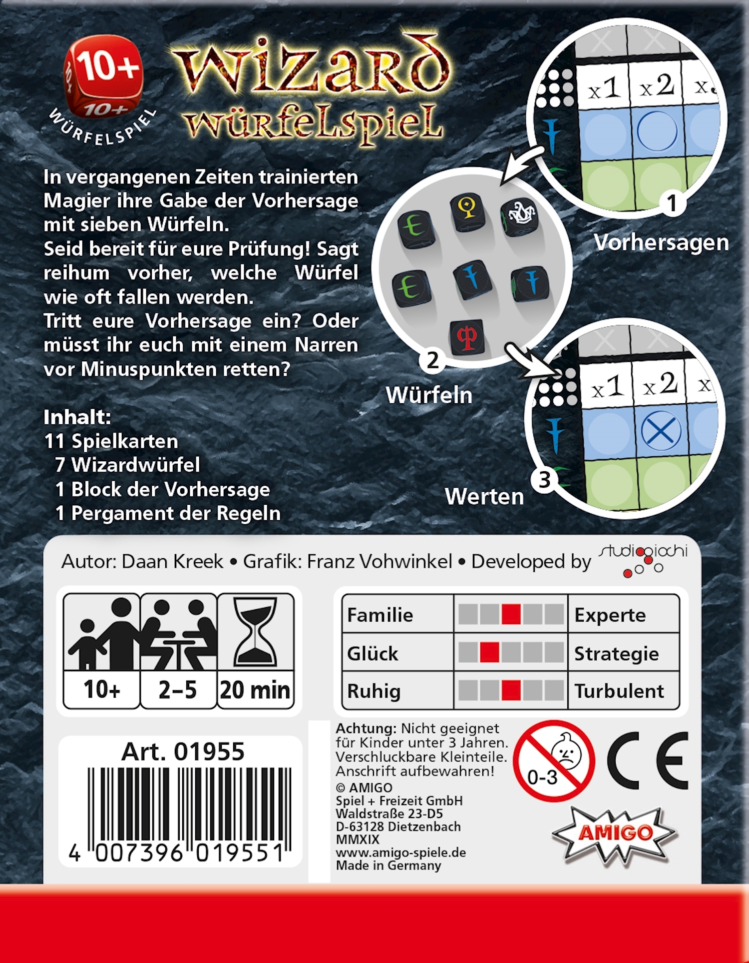 Wizard Würfelspiel Wizard Würfelspiel MBE3 Die Kraft der magischen Würfel In vergangenen Zeiten trainierten Wizards ihre Gabe der Vorhersage mit sieben Würfeln. Bei dieser Prüfung sagen Spielende reihum vorher, welche Würfel wie oft fallen werden. Tritt die Vo...