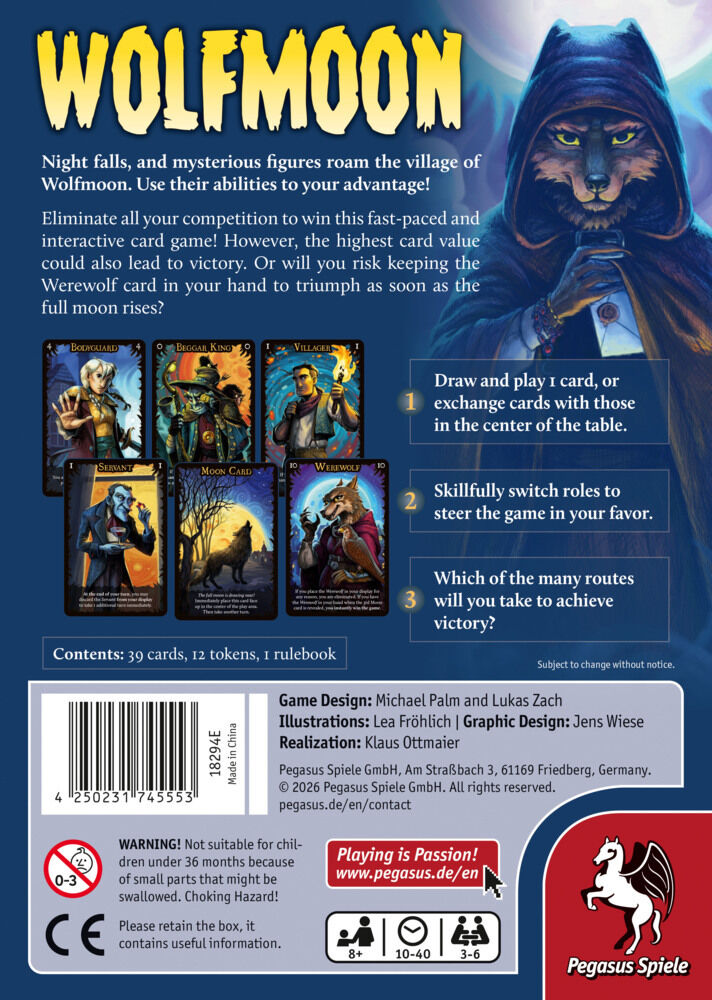 In the interactive card game Wolfmoon, a powerful werewolf lurks among a cast of characterssome honest, some shady. As the night progresses and the full moon rises in the night sky, intrigues are hatched, deals are struck, and bluffs are exposed. Who will mana...