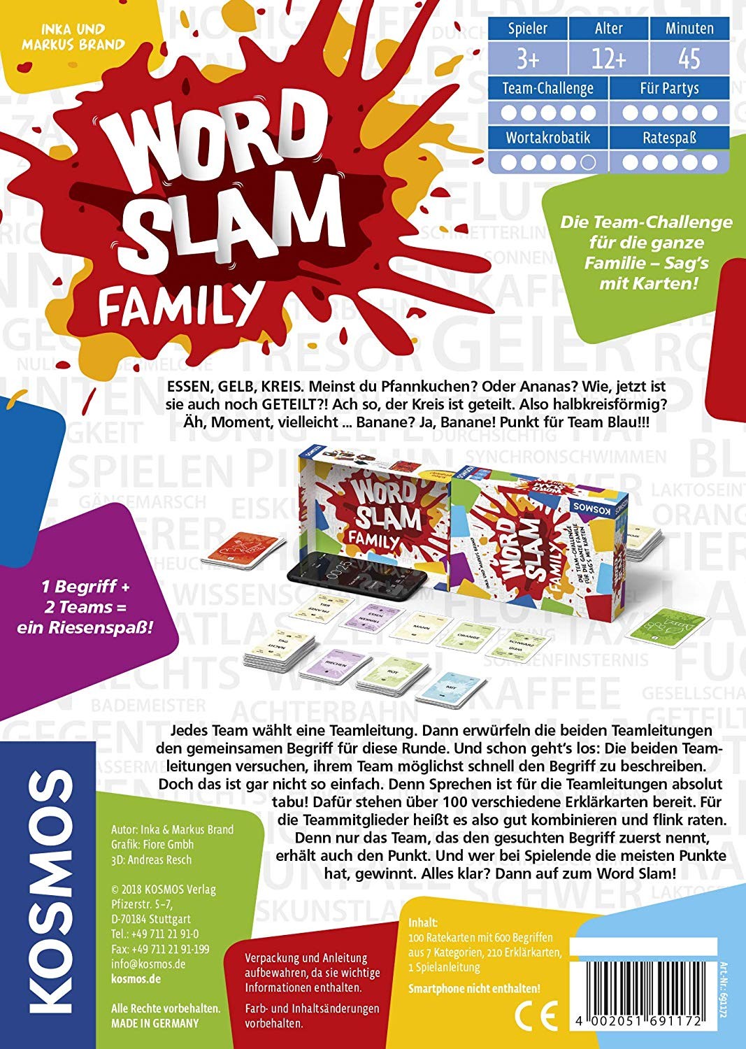Das Kommunikationsspiel Word Slam Family garantiert Spielspaß für die ganze Familie! Die Spieler wählen vier Ratekarten aus sieben Kategorien Essen & Trinken, Tiere, Pflanzen, Kreaturen, Reisen & Outdoor, Geschichte, Filme & Musik & Literatur mischen diese ver...