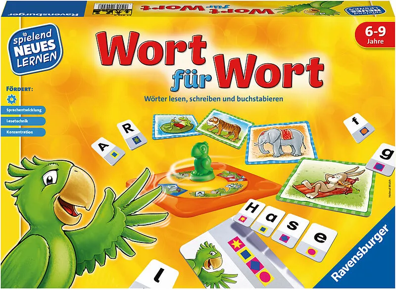 Bei dem Kinderspiel "Wort für Wort" für 1-4 Spieler heißt es Wörter lesen, schreiben und buchstabieren. Wie wird "Pirat" geschrieben Wer legt mit den richtigen Buchstaben das passende Wort zu seinem Bild Wie viele Buchstaben man nehmen darf, zeigt der freche P...