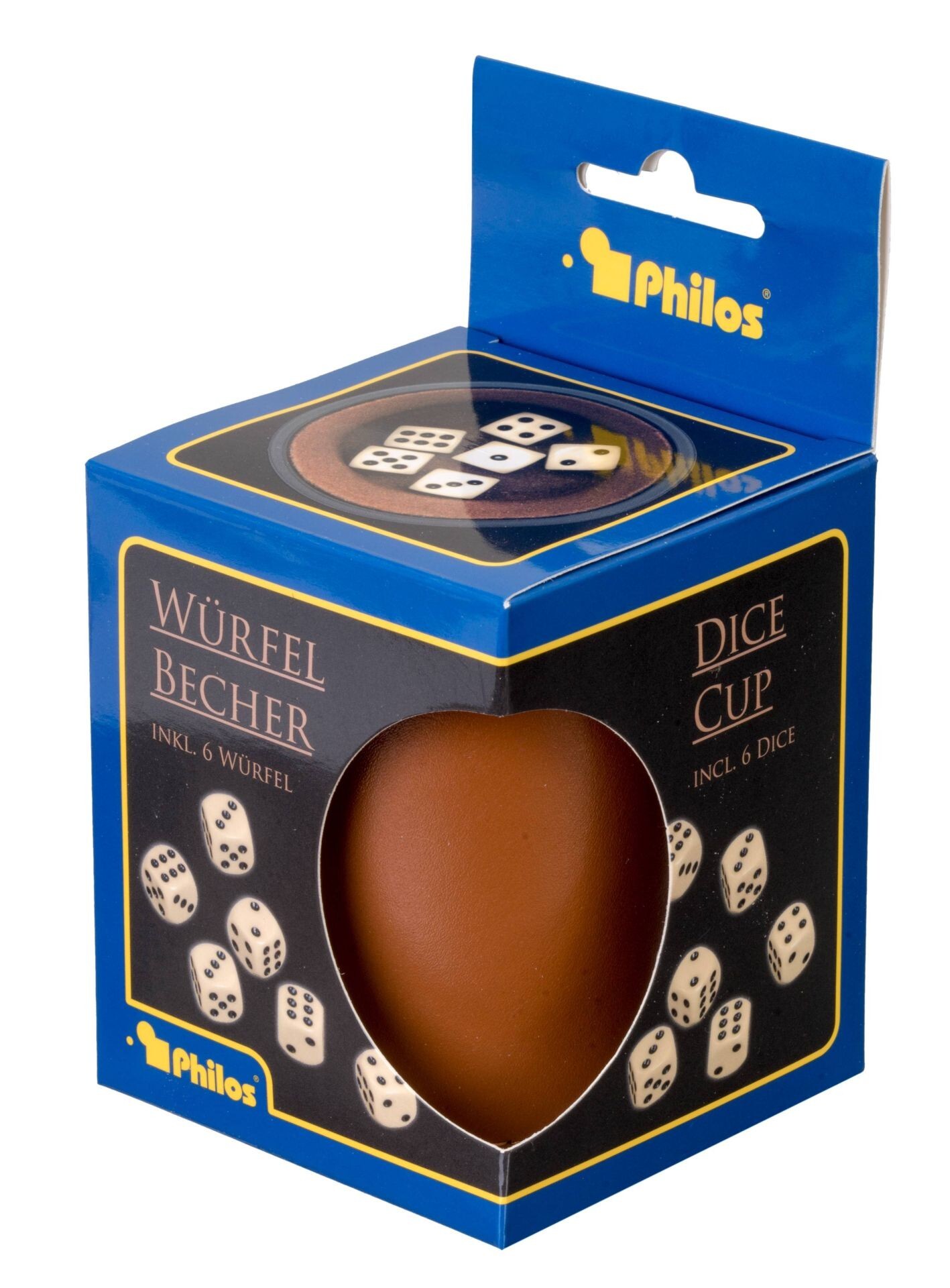 Ein Würfelbecher oder auch Knobelbecher ist ein Becher, in dem bei Würfelspielen mehrere Spielwürfel geschüttelt und dann auf den Tisch geleert werden. Er dient dazu, Unregelmäßigkeiten beim Würfeln zu verhindern. Kunstleder-Würfelbecher (Maße: 94x78x78 mm) In...