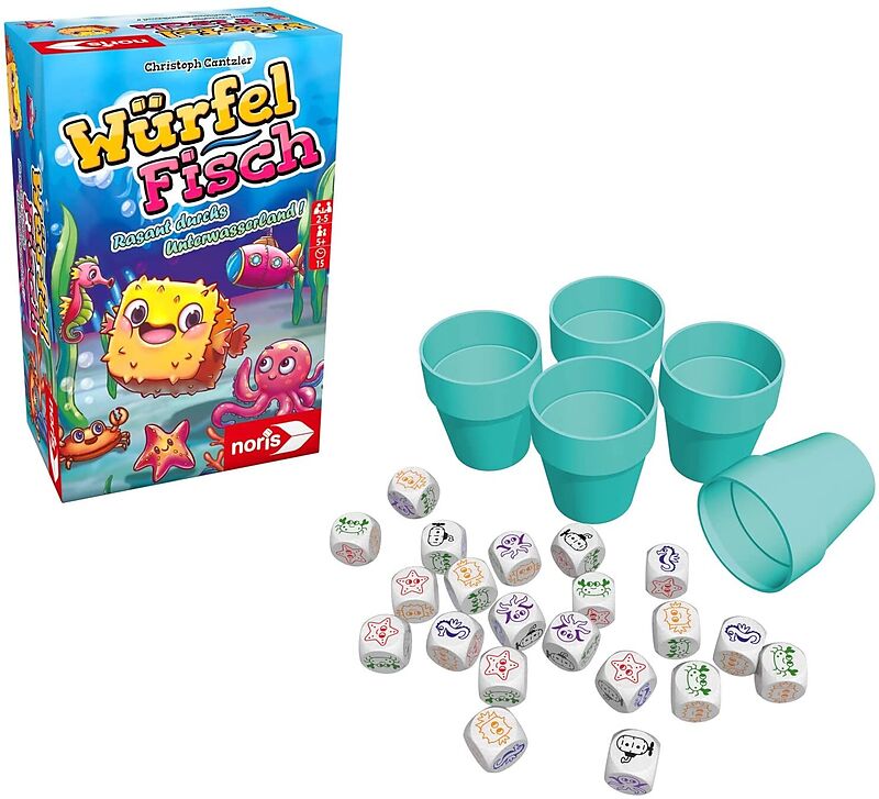 Würfelt schnell die richtigen Meerestiere bei diesem rasanten Reaktionsspiel, mit 21 Würfeln, BSK, 5J+ Hier wird um die Wette gewürfelt-fischt! Bei dem Kinderspiel "Würfelfisch" gibt es jede Menge Action und süße Tierchen aus dem Ozean. Wer von euch erwüfelt m...