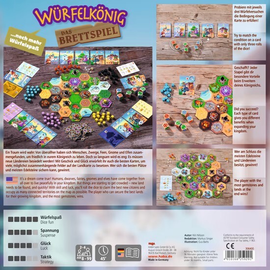 Taktischer Würfelspaß für die ganze Familie mit dem Brettspiel Würfelkönig von HABA: Langsam wird es eng im Königreich. Neue Ländereien müssen besiedelt werden! Mit Geschick und Würfelglück erhalten die Spieler gute Karten, um viele, möglichst zusammenhängende...