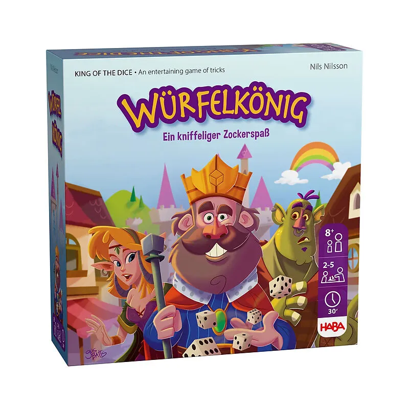 HABA Würfelkönig Die Spieler wollen neue Bürger für ihre Königreiche gewinnen, indem sie mit drei Würfen die unterschiedlichsten Bedingungen auf den Karten erzielen. Sonderkarten verschaffen dabei Vorteile. Aber Achtung vor Dorftrotteln und Drachen! Wer am Sch...