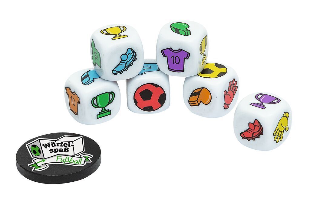 Würfeln, reagieren, gewinnen - Fußballspaß für die ganze Familie!Bei diesem rasanten Spiel ist volle Konzentration gefragt: 25 Würfel mit Fußball-Motiven, ein Holz-Chip und schnelle Reaktionen sorgen für Action am Spieltisch. Sobald ein Symbol doppelt auftauch...