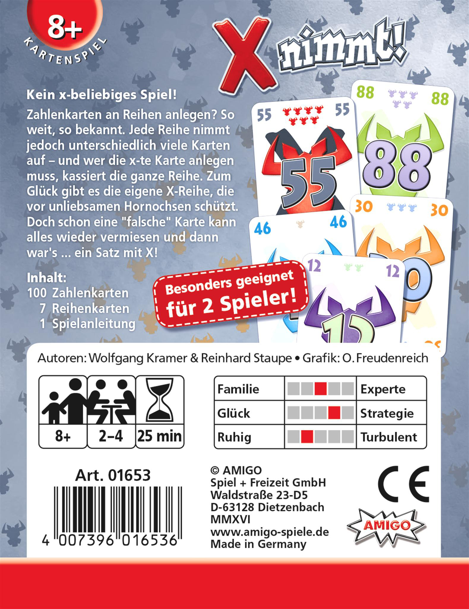Kein x-beliebiges Spiel! Zahlenkarten an Reihen anlegen? So weit, so bekannt. Jede Reihe nimmt jedoch unterschiedlich viele Karten auf - und wer die x-te Karte anlegen muss, kassiert die ganze Reihe. Zum Glück gibt es die eigene X-Reihe, die vor unliebsamen Ho...
