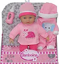 Die süsse Puppe trägt ein Mützchen, ein Oberteil und weiche Hosen. Im Set enthalten sind ein extra Strampelanzug, ein weiteres Mützchen und ein Fläschchen.
