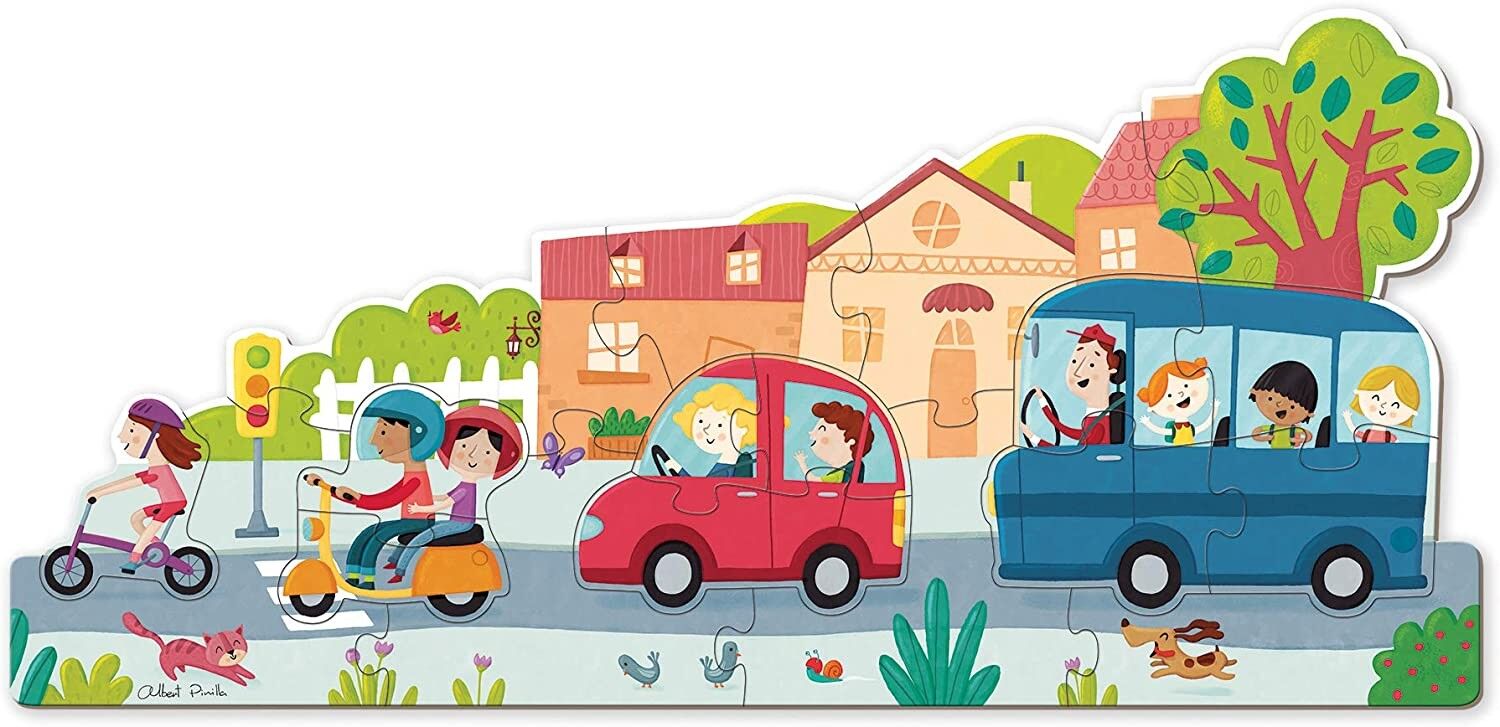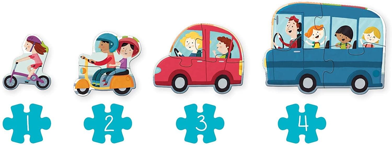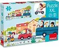 Abbildung von vier Fahrzeugen aus unserem Alltag. 18 XXL-Puzzleteile / Maße des Puzzles: 80 x 38 cm Puzzle aus qualitativ hochwertigem Karton mit extra großen Puzzleteilen. Goula steht für wunderschöne und altersgerechte Puzzles und spiele, die die Fantasie de...