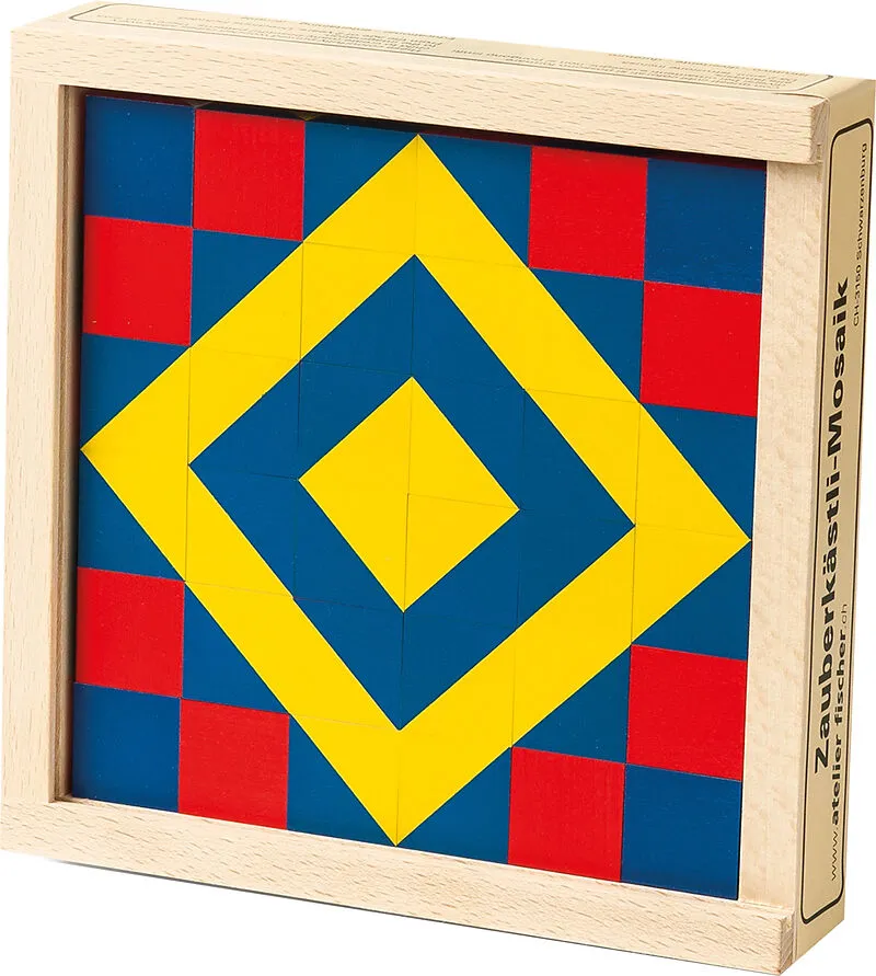 Wenn das gelegte Muster in der Holzschachtel auf den Tisch gestürzt wird, erscheint das gleiche Muster in anderer Farbe, wie durch Zauberei. Das schöne Design und die hochwertige Verarbeitung machen dieses beliebte Spiel zu etwas Besonderem.