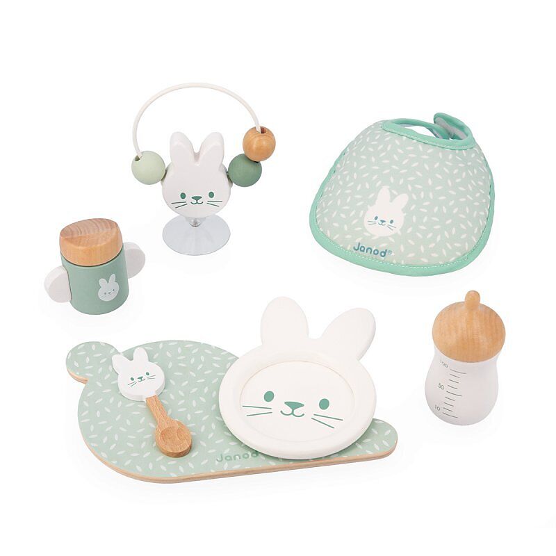 Das Essen ist fertig! Dieses 7-teilige Puppenbaby-Set enthält alles, was wir für das Mittagessen brauchen. Zuerst legen wir dem Baby sein Lätzchen an, dann bereiten wir ihm sein Tablett vor: Teller und Löffel in Kaninchenform, Fläschchen und Schnabeltasse. Um ...