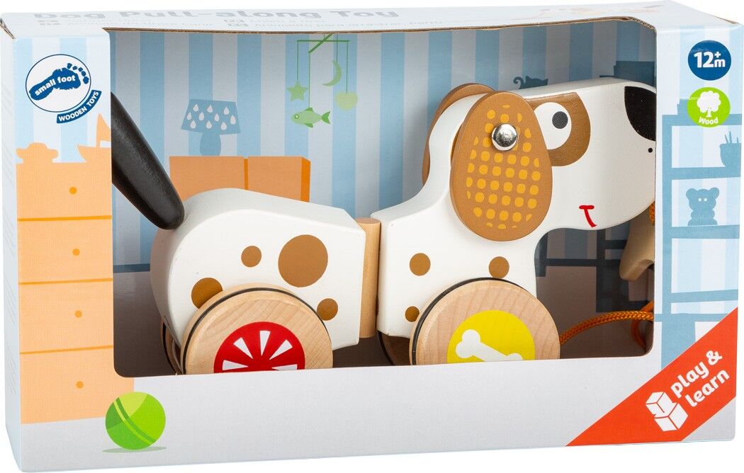 Wuff, Wuff! Diesen niedlichen Hund können die Kleinsten hinter sich herziehen. Durch die Gummiringe an den Reifen ist er sehr geräuscharm. Er wackelt mit Ohren und Rute und macht in jeder Kurve eine gute Figur. Den Knochen an der Leine gibt es als Belohnung. D...