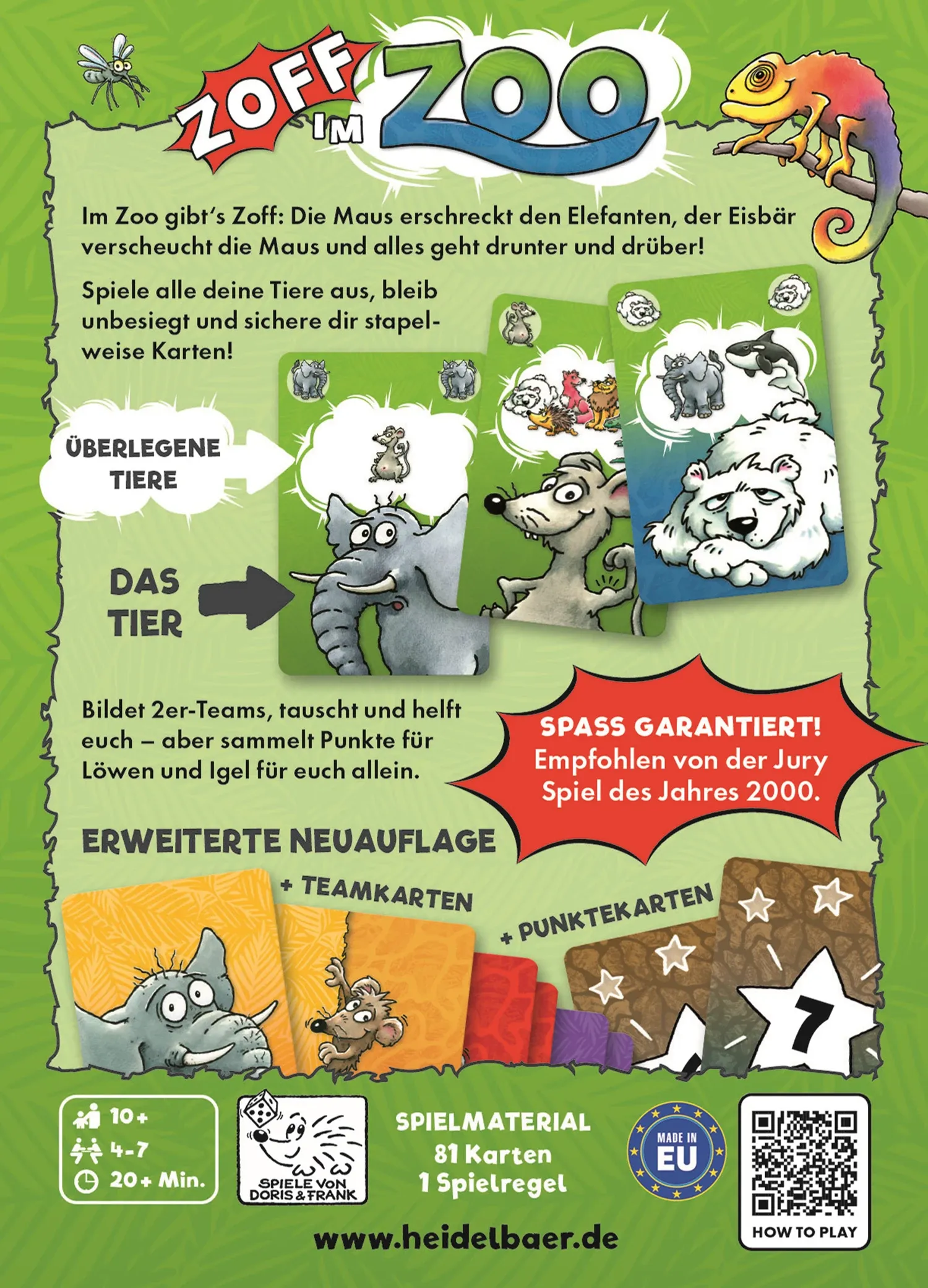 Zoff im Zoo ist das tierisch turbulente Kartenspiel, bei dem nicht Zahlen, sondern Tiere den Ton angeben! Ziel ist es, die eigenen Karten möglichst schnell loszuwerden doch aufgepasst: Nur wer die Nahrungskette und Tieranzahl clever einsetzt, behält die Oberha...