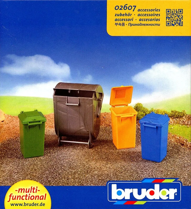 Bruder 02607 Zubehör: Mülltonnen-Set Das Mülltonnen Set besteht aus drei kleinen farbigen und einer großen grauen Tonne. Zur Spielergänzung können die MB Actros Müll-LKWs Art.-Nr.: 02660 und Art.-Nr.: 02661 sowie die MAN Müll-LKWs Art.-Nr.: 02760 und Art.-Nr.:...