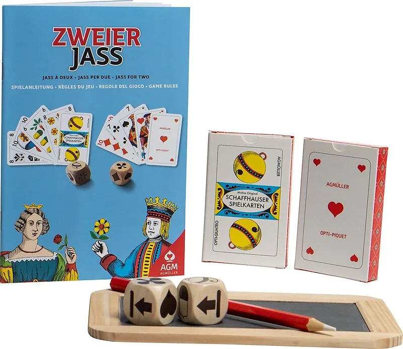 Die 20 beliebtesten Jass-Varianten sind so beschrieben, dass diese auch nur zu zweit gespielt werden können. Wer zudem neue und spannende Varianten entdecken will, setzt den exklusiv für den Zweier-Jass entwickelten, Trumpfwürfel ein.