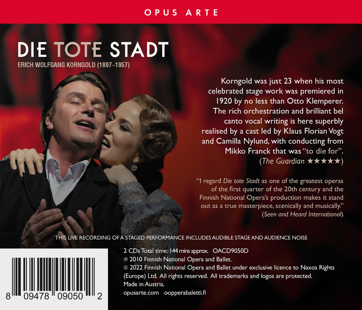 Korngolds frühe Oper "Die tote Stadt" war zunächst ein Riesenerfolg, galt aber bald als veraltet, wurde von den Nazis verboten und schließlich nahezu vergessen. Erst in den 1980er Jahren erlangte das Werk von Berlin ausgehend erneut große Beachtung. Die 2010er...| 1 | Die tote Stadt op. 12 (Oper in 3 Akten) (Gesamtaufnahme) | ||