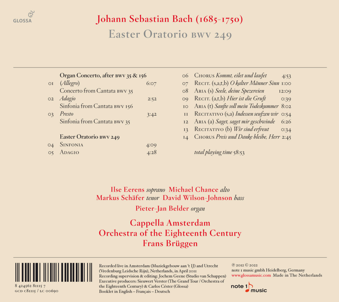 Mit der 2011 entstandenen und von der Kritik seinerzeit hoch gelobten Aufnahme von Bachs Osteroratorium BWV 249 stellten der unvergessene Frans Brüggen und sein Orchestra of the 18th Century gemeinsam mit exzellenten Solisten und der Capella Amsterdam ein weit...| 1 | Organ Concerto, after BWV 35 & 156 | ||