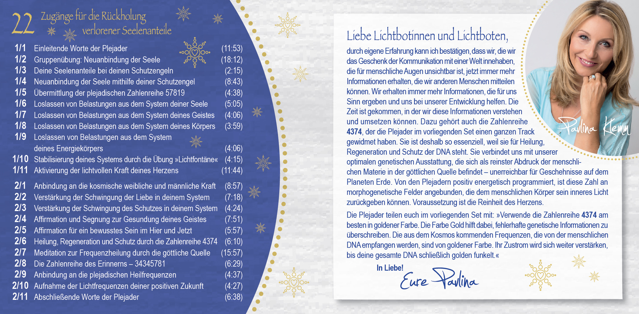 22 ANBINDUNGEN ANS LICHT ZUR HEILUNG DEINER SEELE empfangen & gesprochen von Pavlina Klemm Nach einer Neuanbindung der Seele an den menschlichen Körper kannst du Belastungen aus den Systemen von Körper, Geist und Seele loslassen, dein System stabilisieren, deine Schutzschwingung erhöhen und dich an deine positive Zukunft anbinden. Zahlenreihen, Affirmationen und Segnungen ergänzen deine Heilarbeit. Die von Pavlina gesprochenen Übungen sind von den Plejadern positiv energetisch aufgeladen und werden durch Heilklänge von Sayama ergänzt. Insgesamt 2,6 Stunden geführte Meditationen. Das downloadbare 10-Seiten-Booklet enthält ein exklusiv gechanneltes Heilsymbol für die Seelenanbindung und eine zusätzliche Übung zur Vorbereitung auf die Neuanbindung der Seele. »Das reinste göttliche Hologramm des Menschen in der Quelle wurde bisher nicht gestört.« Pavlina Klemm Pavlina Klemm, geboren in Tschechien, lebt und arbeitet in der Nähe von München. Sie ist ausgebildet in Quantenheilung, Reconnective Healing sowie Neuer Homöopathie und in russischen Heilmethoden. Tausende besuchten schon ihre Workshops. Ihre Bücher und CDs »Lichtbotschaften von den Plejaden« sind Bestseller der Channeling-Literatur.. Die Begleitmusik stammt von Sayama. Schon sein Leben lang setzt er musikalisch Impulse für ein erfülltes und vitales Sein. Er schrieb ein Wasserbuch mit Masaru Emoto, Filmmusik für Pierre Franckh und begleitete musikalisch viele geführte Meditationen, darunter von Louise L. Hay, Drunvalo Melchizedek und Kurt Tepperwein. Und hier findest du den Inhalt der CDs ... CD 1 1. Einleitende Worte der Plejader (11:53) 2. Gruppenübung: Neuanbindung der Seele (18:12) 3. Deine Seelenanteile bei deinen Schutzengeln (2:15) 4. Neuanbindung der Seele mithilfe deiner Schutzengel (8:43) 5. Übermittlung der plejadischen Zahlenreihe 57819 (4:38) 6. Loslassen von Belastungen aus dem System deiner Seele (5:05) 7. Loslassen von Belastungen aus dem System deines Geistes (4:06) 8. Loslassen von Belastungen aus dem System deines Körpers (3:59) 9. Loslassen von Belastungen aus dem System deines Energiekörpers (4:06) 10. Stabilisierung deines Systems durch die Übung »Lichtfontäne« (4:15) 11. Aktivierung der lichtvollen Kraft deines Herzens (11:44) CD 2 1. Anbindung an die kosmische weibliche und männliche Kraft (8:57) 2. Verstärkung der Schwingung der Liebe in deinem System (7:18) 3. Verstärkung der Schwingung des Schutzes in deinem System (4:24) 4. Affirmation und Segnung zur Gesundung deines Geistes (7:51) 5. Affirmation für ein bewusstes Sein im Hier und Jetzt (5:57) 6. Heilung, Regeneration und Schutz durch die Zahlenreihe 4374 (6:10) 7. Meditation zur Frequenzheilung durch die göttliche Quelle (15:57) 8. Die Zahlenreihe des Erinnerns 34345781 (6:29) 9. Anbindung an die plejadischen Heilfrequenzen (4:37) 10. Aufnahme der Lichtfrequenzen deiner positiven Zukunft (4:27) 11. Abschließende Worte der Plejader (6:38) Liebe Lichtbotinnen und Lichtboten, durch eigene Erfahrung kann ich bestätigen, dass wir, die wir das Geschenk der Kommunikation mit einer Welt innehaben, die für menschliche Augen unsichtbar ist, jetzt immer mehr Informationen erhalten, die wir anderen Menschen mitteilen können. Wir erhalten immer mehr Informationen, die für uns Sinn ergeben und uns bei unserer Entwicklung helfen. Die Zeit ist gekommen, in der wir diese Informationen verstehen und umsetzen können. Dazu gehört auch die Zahlenreihe 4374, der die Plejader im vorliegenden Set einen ganzen Track gewidmet haben. Sie ist deshalb so essenziell, weil sie für Heilung, Regeneration und Schutz der DNA steht. Sie verbindet uns mit unserer optimalen genetischen Ausstattung, die sich als reinster Abdruck der menschlichen Materie in der göttlichen Quelle befindet unerreichbar für Geschehnisse auf dem Planeten Erde. Von den Plejadern positiv energetisch programmiert, ist diese Zahl an morphogenetische Felder angebunden, die dem menschlichen Körper sein inneres Licht zurückgeben können. Voraussetzung ist die Reinheit des Herzens. In Liebe, Pavlina