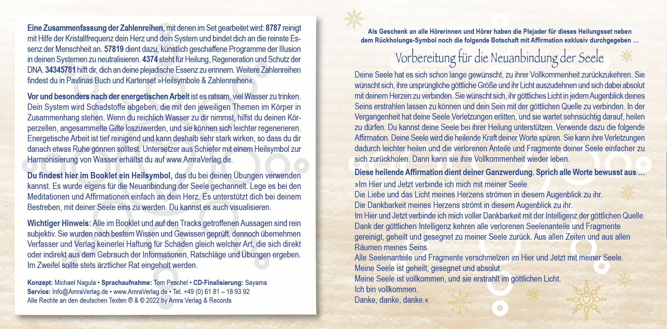 Als Geschenk an alle Hörerinnen und Hörer haben die Plejader für dieses Heilungsset neben dem Rückholungs-Symbol noch die folgende Botschaft mit Affirmation exklusiv durchgegeben ...VORBEREITUNG FÜR DIE NEUANBINDUNG DER SEELEDeine Seele hat es sich schon lange gewünscht, zu ihrer Vollkommenheit zurückzukehren. Sie wünscht sich, ihre ursprüngliche göttliche Größe und ihr Licht auszudehnen und sich dabei absolut mit deinem Herzen zu verbinden. Sie wünscht sich, ihr göttliches Licht in jedem Augenblick deines Seins erstrahlen lassen zu können und dein Sein mit der göttlichen Quelle zu verbinden. In der Vergangenheit hat deine Seele Verletzungen erlitten, und sie wartet sehnsücht…