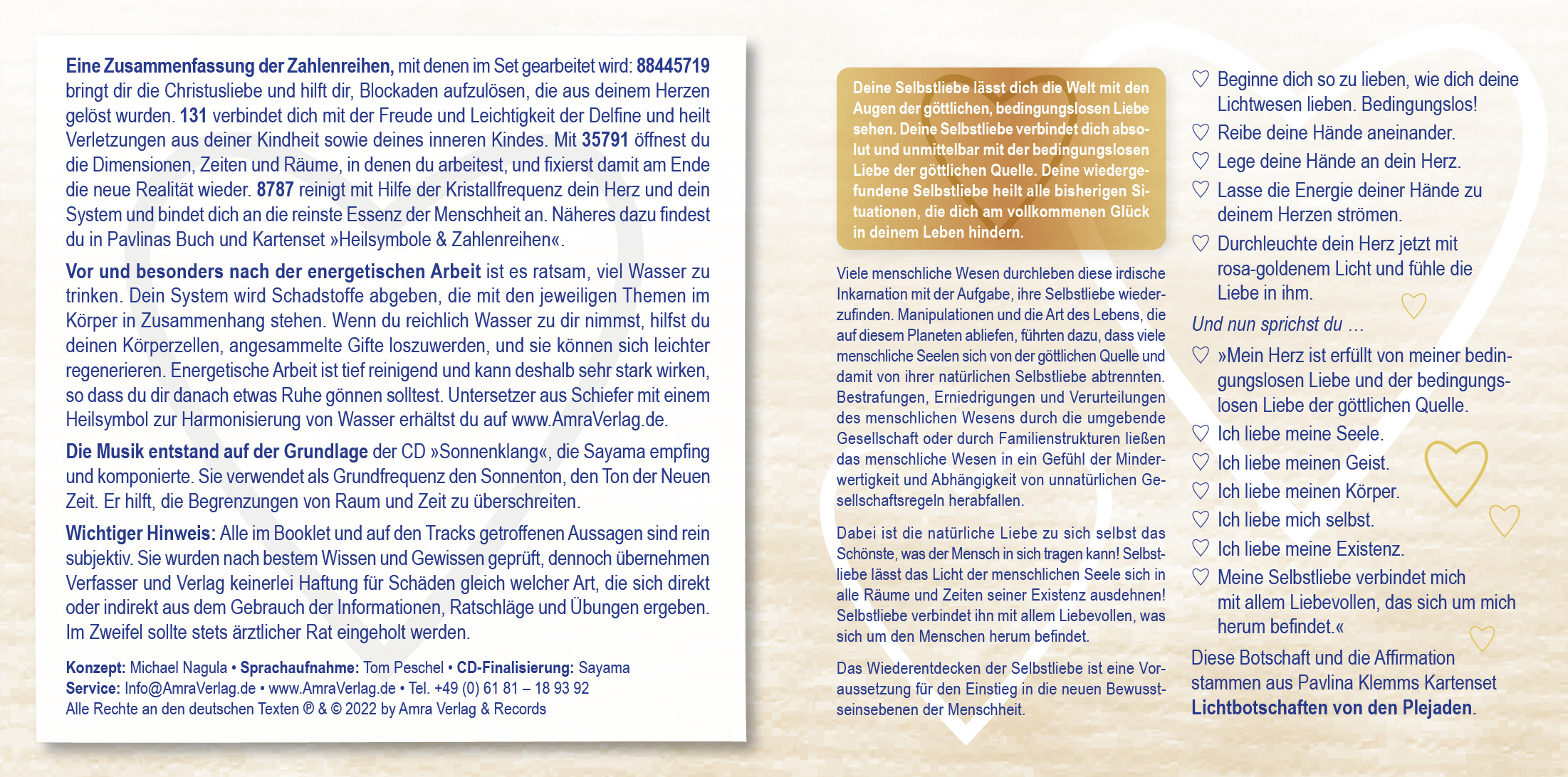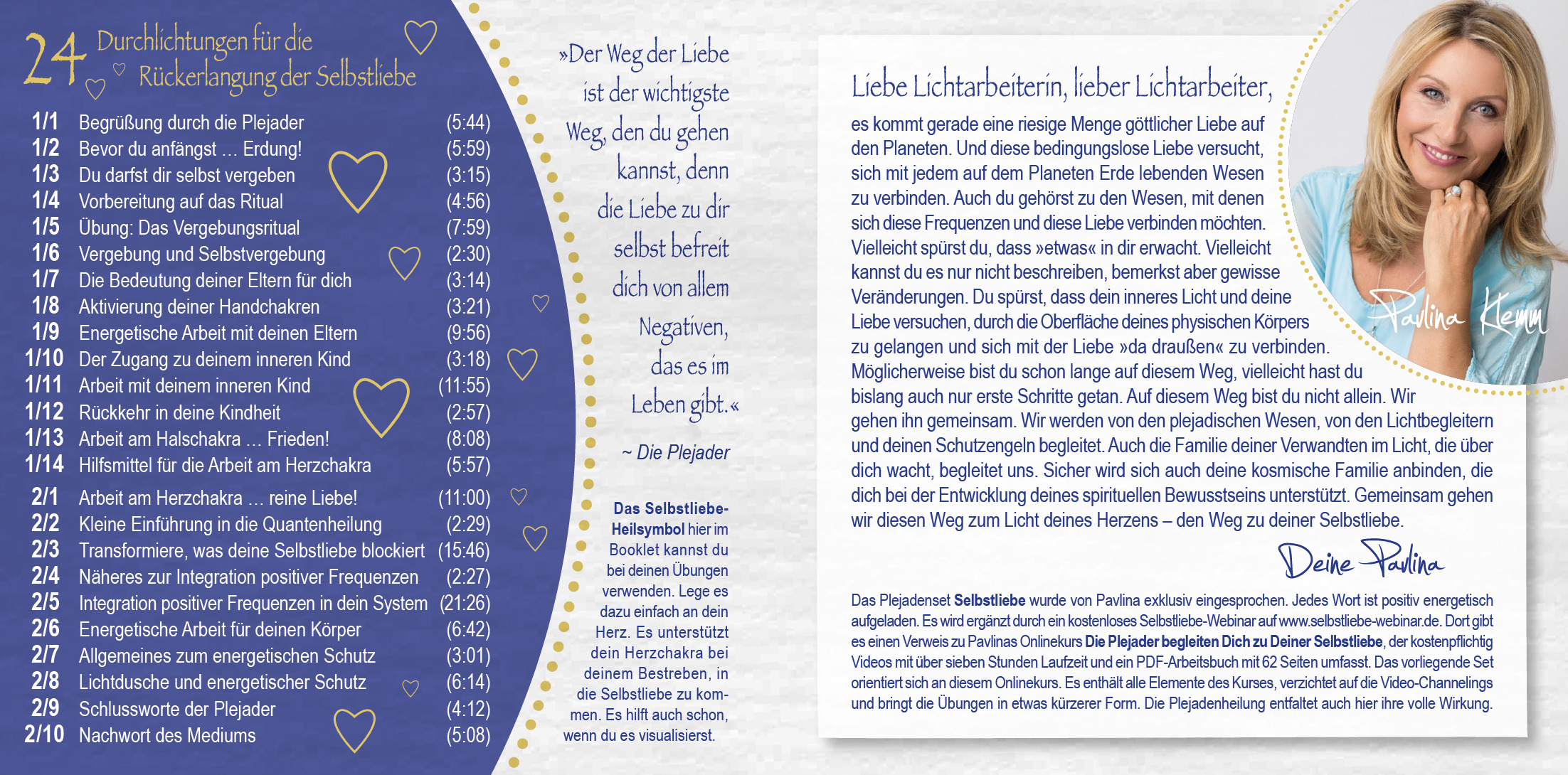 24 SCHRITTE ZUR SELBSTLIEBE UND ZUR REINHEIT DEINES HERZENSempfangen & gesprochen von Pavlina KlemmNach einer Begrüßung durch die Plejader führt dich dein Weg über Vergebung und Selbstvergebung zur energetischen Arbeit mit deinen Eltern und deinem inneren ...24 SCHRITTE ZUR SELBSTLIEBE UND ZUR REINHEIT DEINES HERZENSempfangen & gesprochen von Pavlina KlemmNach einer Begrüßung durch die Plejader führt dich dein Weg über Vergebung und Selbstvergebung zur energetischen Arbeit mit deinen Eltern und deinem inneren Kind. Blockaden werden aufgelöst, positive Frequenzen integriert und Schutz aufgebaut. Du meditierst mit einem Heilsymbol und Zahlenreihen zu den energetisch aufgeladenen Worten der Plejader, gesprochen von Pavlina Klemm, ergänzt durch Heilklänge von Sayama.Insgesamt 2,6 Stunden geführte Meditationen. Das downloadbare 10-Seiten-Booklet enthält ein Heilsymbol für die energetische Arbeit und eine zusätzliche Übung für die Selbstliebe als Einstieg in die neuen Bewusstseinsebenen der Menschheit.»Alles strebt auf Liebe zu. Alles strebt auf Vollkommenheit zu.« - Pavlina KlemmPavlina Klemm, geboren in Tschechien, lebt und arbeitet in der Nähe von München. Sie ist ausgebildet in Quantenheilung und Methoden der Rückverbindung sowie in Neuer Homöopathie und russischen Heilverfahren. Tausende besuchen ihre physischen Workshops und Online-Seminare. Ihre Bücher und CDs »Lichtbotschaften von den Plejaden« sind Bestseller der Channeling-Literatur.Die Begleitmusik stammt von Sayama. Schon sein Leben lang setzt er musikalisch Impulse für ein erfülltes und vitales Sein. Er schrieb ein Wasserbuch mit Masaru Emoto, Filmmusik für Pierre Franckh und begleitete musikalisch viele geführte Meditationen, darunter von Louise L. Hay, Drunvalo Melchizedek und Kurt Tepperwein.Und hier findest du den Inhalt der CDs ...CD 1 1 Begrüßung durch die Plejader (5:44) 2 Bevor du anfängst ... Erdung! (5:59) 3 Du darfst dir selbst vergeben (3:15) 4 Vorbereitung auf das Ritual (4:56) 5 Übung: Das Vergebungsritual (7:59) 6 Vergebung und Selbstvergebung (2:30) 7 Die Bedeutung deiner Eltern für dich (3:14) 8 Aktivierung deiner Handchakren (3:21) 9 Energetische Arbeit mit deinen Eltern (9:56)10 Der Zugang zu deinem inneren Kind (3:18)11 Arbeit mit deinem inneren Kind (11:55)12 Rückkehr in deine Kindheit (2:57)13 Arbeit am Halschakra ... Frieden! (8:08)14 Hilfsmittel für die Arbeit am Herzchakra (5:57)CD 2 1 Arbeit am Herzchakra ... reine Liebe! (11:00) 2 Kleine Einführung in die Quantenheilung (2:29) 3 Transformiere, was deine Selbstliebe blockiert (15:46) 4 Näheres zur Integration positiver Frequenzen (2:27) 5 Integration positiver Frequenzen in dein System (21:26) 6 Energetische Arbeit für deinen Körper (6:42) 7 Allgemeines zum energetischen Schutz (3:01) 8 Lichtdusche und energetischer Schutz (6:14) 9 Schlussworte der Plejader (4:12)10 Nachwort des Mediums (5:08)Liebe Lichtarbeiterin, lieber Lichtarbeiter, es kommt gerade eine riesige Menge göttlicher Liebe auf den Planeten. Und diese bedingungslose Liebe versucht, sich mit jedem auf dem Planeten Erde lebenden Wesen zu verbinden. Auch du gehörst zu den Wesen, mit denen sich diese Frequenzen und diese Liebe verbinden möchten. Vielleicht spürst du, dass »etwas« in dir erwacht. Vielleicht kannst du es nur nicht beschreiben, bemerkst aber gewisse Veränderungen. Du spürst, dass dein inneres Licht und deine Liebe versuchen, durch die Oberfläche deines physischen Körpers zu gelangen und sich mit der Liebe »da draußen« zu verbinden. Möglicherweise bist du schon lange auf diesem Weg, vielleicht hast du bislang auch nur erste Schritte getan.Auf diesem Weg bist du nicht allein. Wir gehen ihn gemeinsam. Wir werden von den plejadischen Wesen, von den Lichtbegleitern und deinen Schutzengeln begleitet. Auch die Familie deiner Verwandten im Licht, die über dich wacht, begleitet uns. Sicher wird sich auch deine kosmische Familie anbinden, die dich bei der Entwicklung deines spirituellen Bewusstseins unterstützt. Gemeinsam gehen wir diesen Weg zum Licht deines Herzens - den Weg zu deiner Selbstliebe.Deine Pavlina