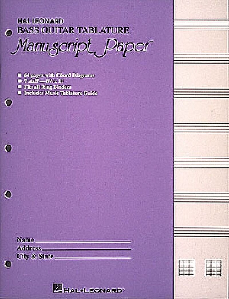 (Manuscript Paper). 64-page stitched book; 8 1/2 x 11; seven 4-line staves on each page; 8 blank chord diagrams printed at bottoof each page; punched to fit all ring binders; contains Music Tablature Guide.