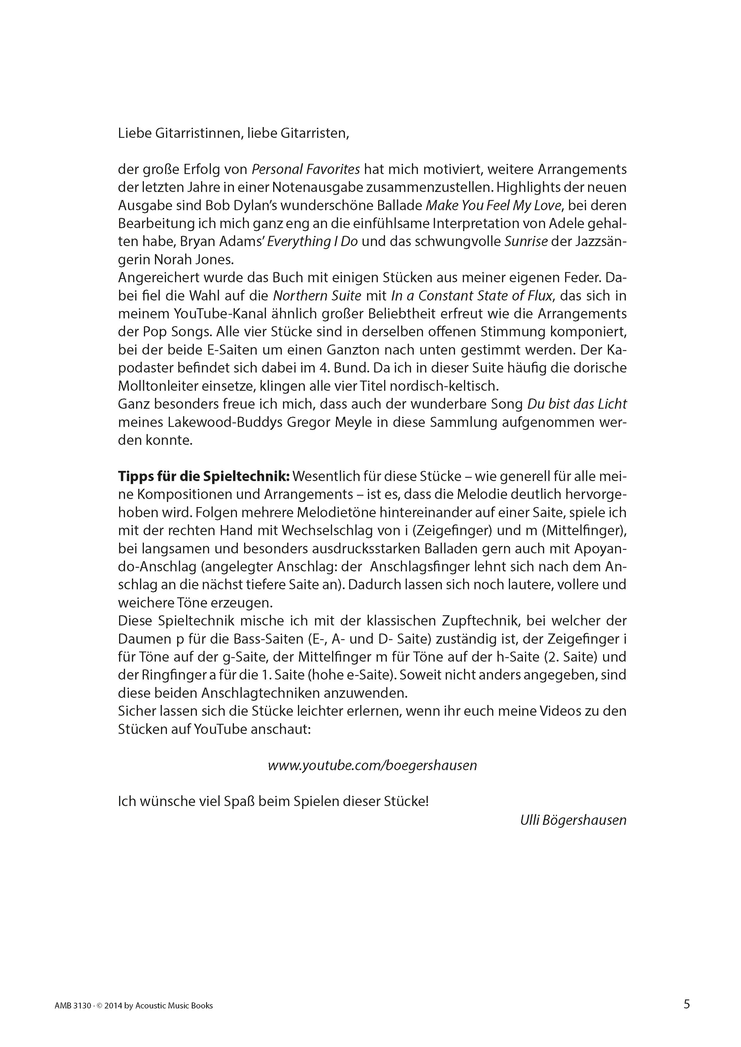 Der große Erfolg von "Personal Favorites" (AMB 3068) hat Ulli Bögershausen ermuntert, weitere Fingerstyle-Arrangements berühmter Popsongs zu veröffentlichen. Zu den bearbeiteten Titeln gehören:- Bob Dylan: Make You Feel My Love- Bryan Adams: Everythi...