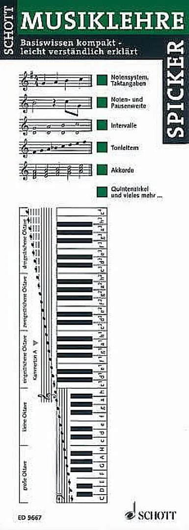 InhaltNotensystem, Taktangaben - Noten- und Pausenwerte - Intervalle - Tonleitern - Akkorde - Quintenzirkel u. v. m.