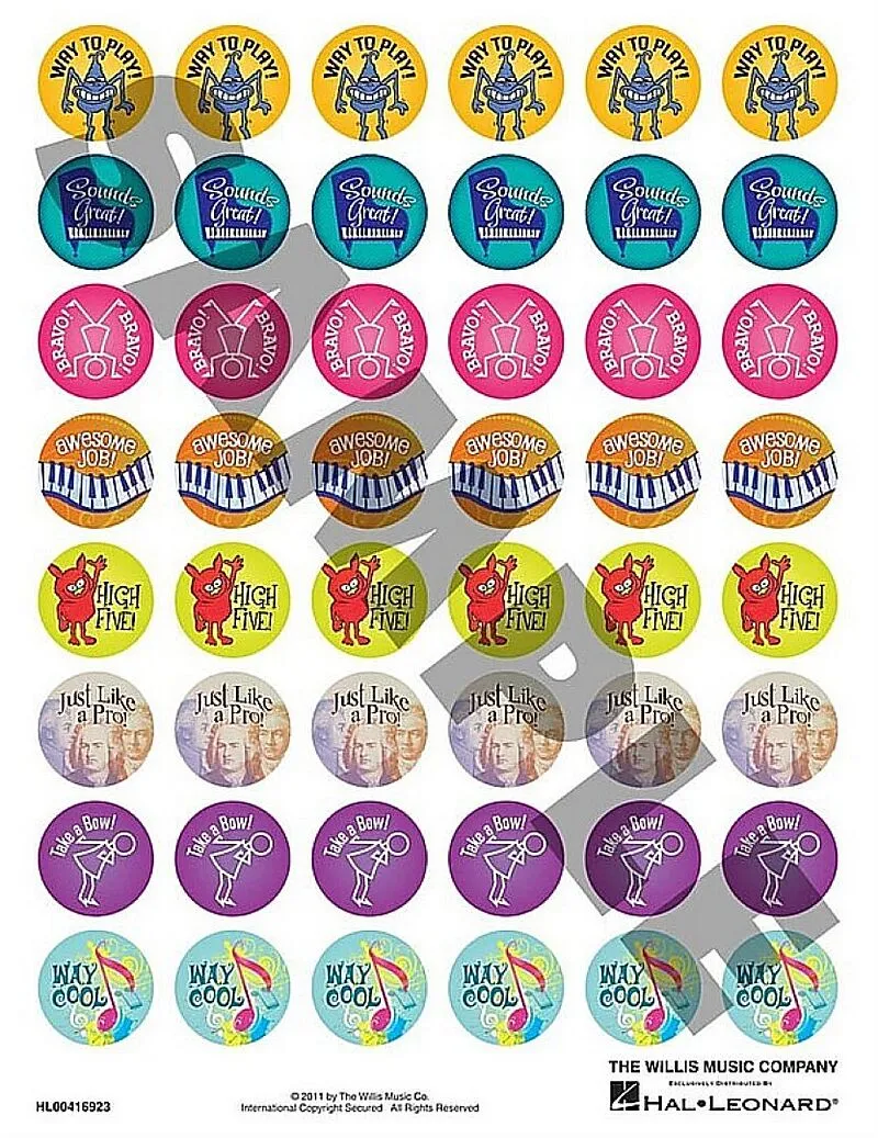 (Willis). 96 full color fun and motivational stickers that students will love. 8 different designs 12 stickers per design - several influenced by popular Willis publications! Actual size is 1-inch for each one.