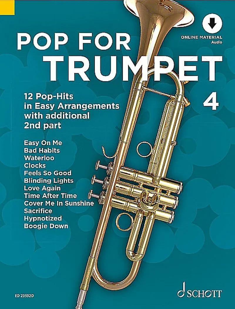 Volume 4 in the Pop for Trumpet series features 12 easy arrangements for 1-2 players and backing tracks for all songs. Current chart hits like Easy On Me or Blinding Lights are right next to pop classics Time After Time and Clocks. Real trumpet highlights incl...