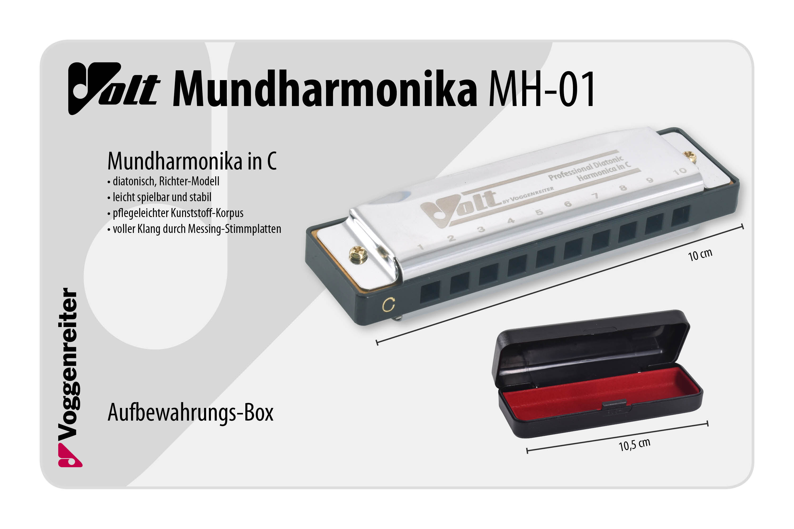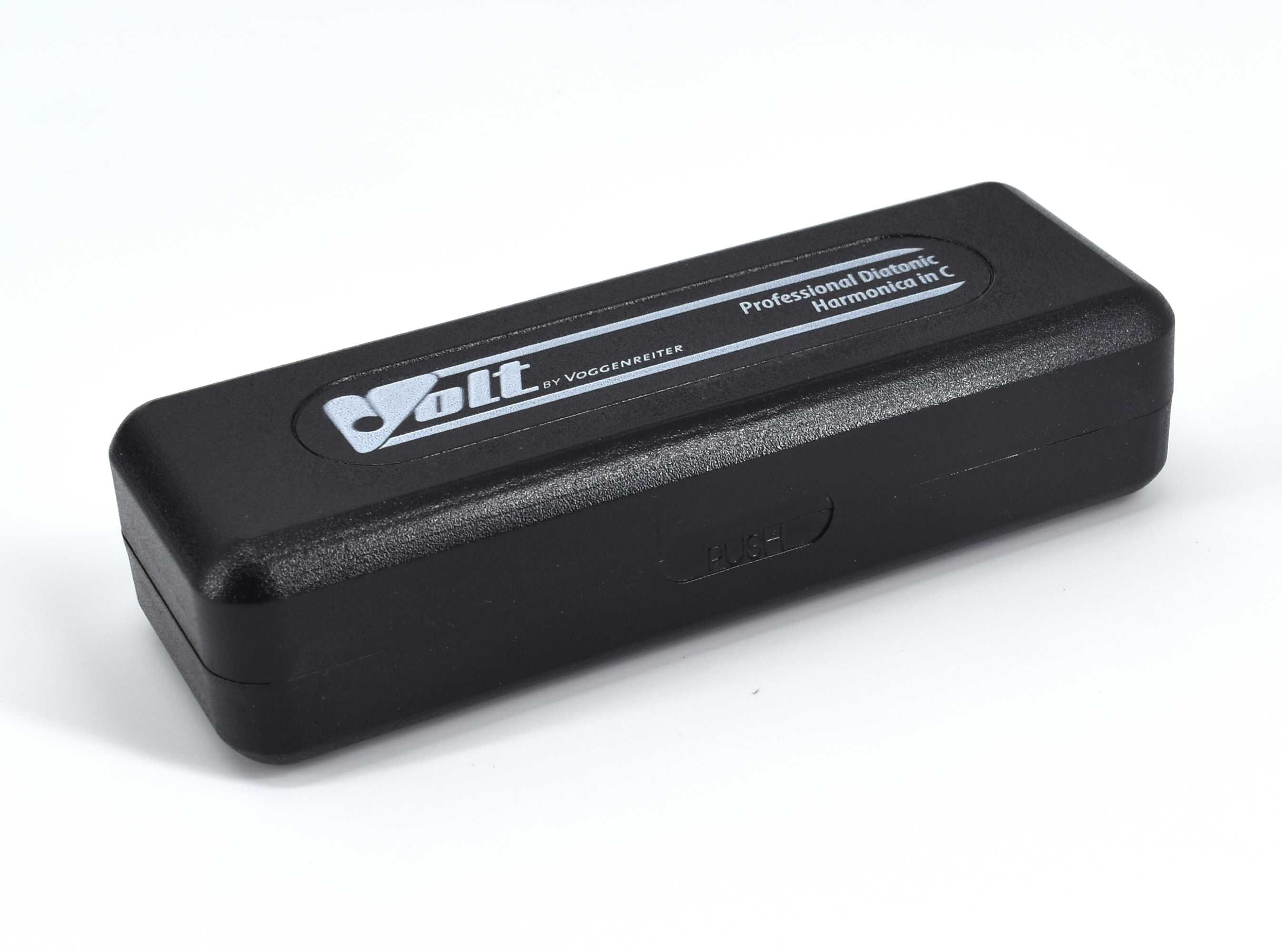 VOLT Mundharmonika Die VOLT Mundharmonika ist in C gestimmt (diatonisch, Blues Harp, Richter-Modell). Weitere Eigenschaften: Deckel aus Edelstahl, ABS-Kanzellenkörper und Messing-Stimmplatten. Die Mundharmonika ist stabil, leicht spielbar und hat einen vollen ...
