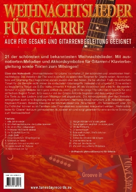 21 der schönsten und bekanntesten Weihnachtslieder sind hier in melodisch einfach zu spielenden Tonarten für Gitarre notiert. Texte für Gesang, Akkordsymbole für Harmonieinstrumente sowie Griffdiagramme für Gitarre ergänzen dieses Notenheft für die ganze Famil...