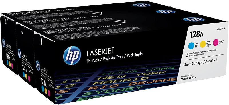 HP - 128A - Tonerkartusche, Cyan, Magenta, Gelb Mit HP 128A LaserJet Druckkassetten können Sie mehr drucken und sparen, ohne auf die Zuverlässigkeit von Original HP Produkten verzichten zu müssen. Die Dreierpacks entwickelt für hohe Auflagen in Fotoqualität s...